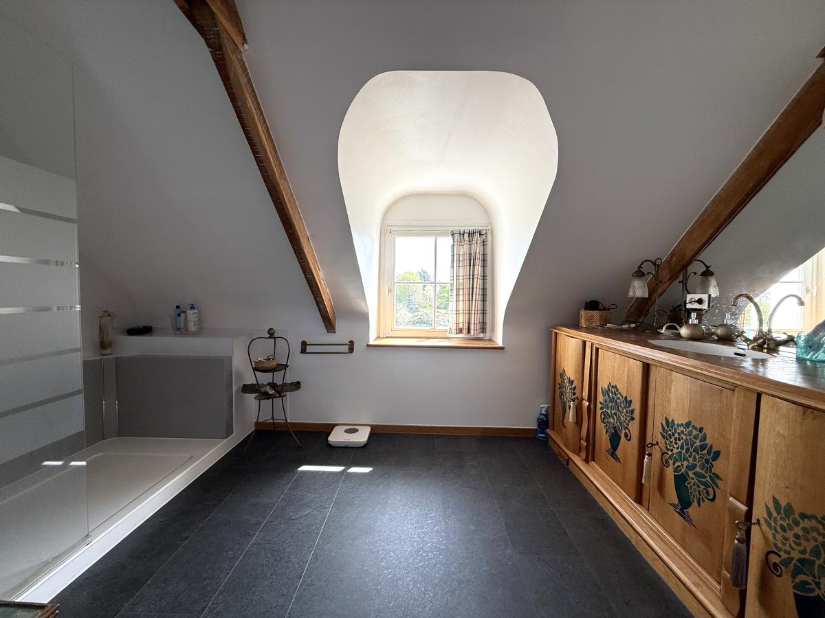 Le bien propose un grand salon chaleureux avec cheminée, ainsi qu’un accès direct à la seconde maison, permettant une organisation modulable (résidence principale, maison familiale, ou projet locatif).