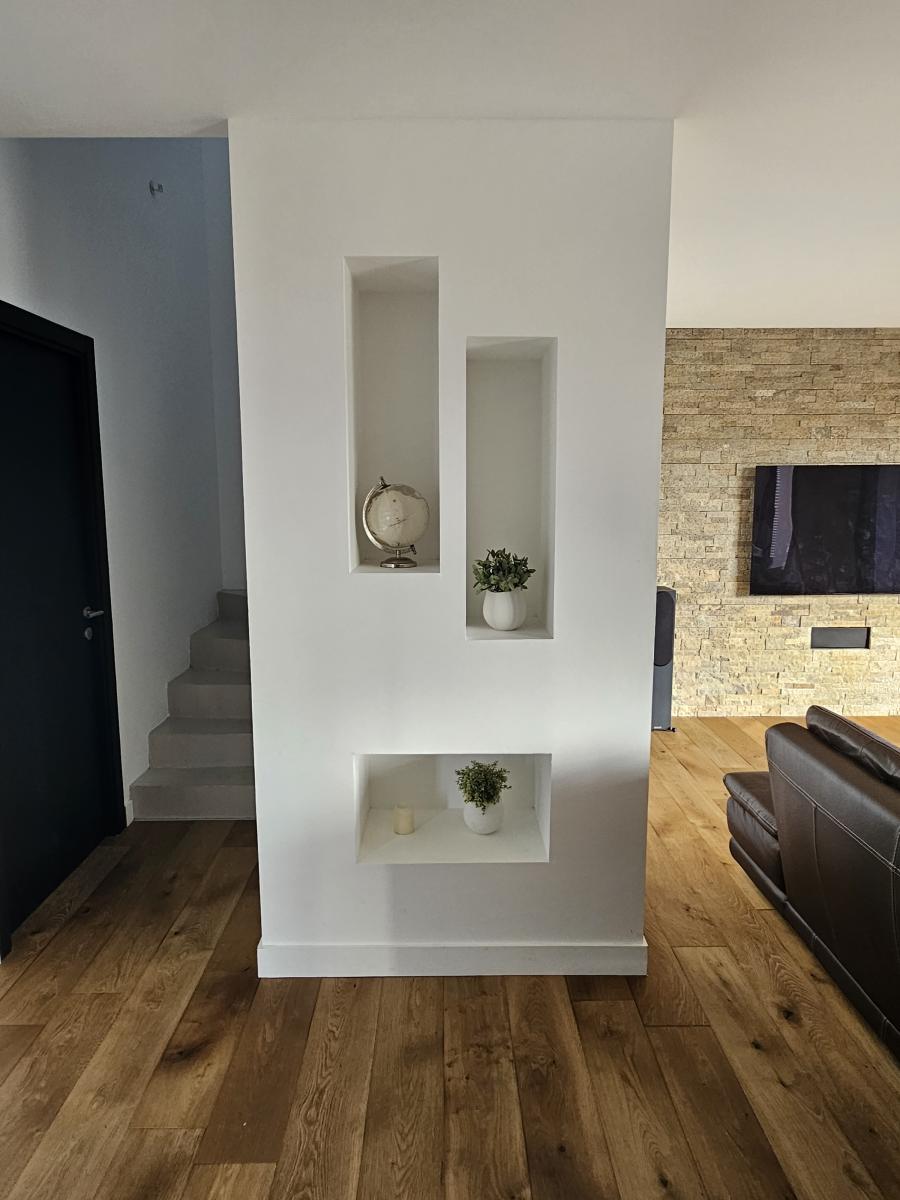L’intérieur s’organise autour d’une entrée indépendante menant à une vaste pièce de vie lumineuse comprenant séjour et salon. La cuisine ouverte, prolongée par un coin repas, s’intègre parfaitement à l’ensemble et crée un espace convivial. Le rez-de-chaussée dispose d’une suite parentale avec dressing et salle d’eau, offrant une vie de plain-pied confortable.